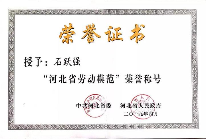 王啟良副主席在迎賓大廳宣讀了中共河北省委、河北省人民政府對(duì)石躍強(qiáng)同志的表彰決定,并與石總持獎(jiǎng)?wù)潞妥C書在普陽辦公樓前廳合影留念。
