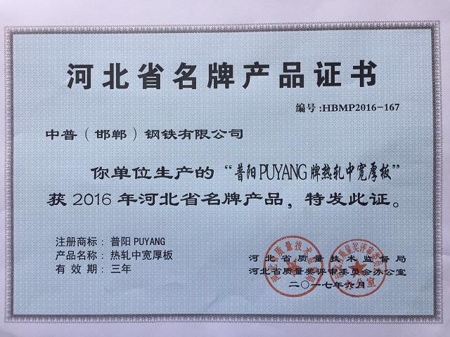 近日,河北省質(zhì)量技術(shù)監(jiān)督局、河北省質(zhì)量獎評審委員會辦公室,為我公司頒發(fā)了《河北省名牌產(chǎn)品證書》。我公司“熱軋中寬厚板”,榮獲“2016年河北省名牌產(chǎn)品”稱號。