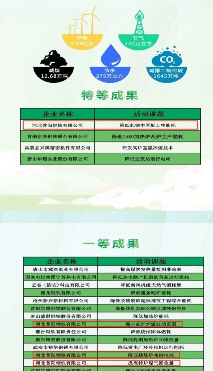 ? ? ? 本次征集活動,堅持全員參與、注重實(shí)效、促進(jìn)交流的原則,采用自主申報、推薦等方式,共征集業(yè)績成果169項,主要涉及節(jié)能、節(jié)水、二氧化碳和重點(diǎn)污染物減排等方面,經(jīng)行業(yè)專家評審,評出特等成果4項,一等成果30項,二等成果45項。其中,河北普陽鋼鐵有限公司(以下簡稱“普陽”)提交的降低軋鋼中厚板工序能耗課題獲評特等成果,縮小高爐爐溫波動范圍、降低精煉爐噸鋼電耗以及提高轉(zhuǎn)爐煤氣回收量3項課題被評為一等成果。據(jù)不完全統(tǒng)計,本次評定的成果應(yīng)用經(jīng)濟(jì)效益可達(dá)3.63億元/年。年節(jié)電4.49億kWh、節(jié)氣730萬m3、減煤12.68萬t、壓采地下水275萬m3、減排CO21645萬噸,大幅削減重點(diǎn)污染物排放。