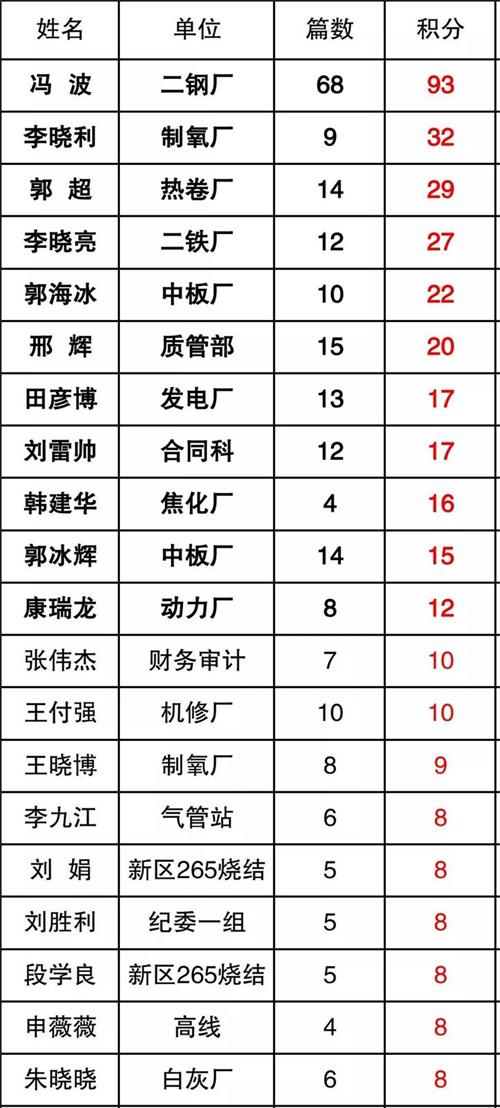 從積分表中,不難看出,普陽煉鋼廠、制氧廠、熱卷廠、中普煉鐵廠、中板廠、質(zhì)管部、發(fā)電廠、合同科、焦化廠、動(dòng)力廠等單位在企業(yè)文宣方面重視力度較高,特別是普陽煉鋼廠,通過有力的組織激勵(lì)措施,發(fā)動(dòng)廣大工友積極投稿,通過集體的力量,高居積分榜首,值得各廠借鑒。
