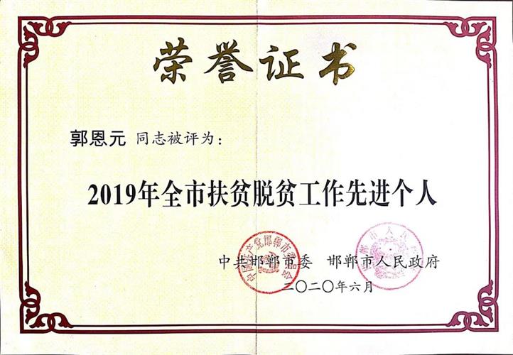 河北普陽(yáng)鋼鐵集團(tuán)黨委書(shū)記、董事長(zhǎng)郭恩元被授予“2019年全市扶貧脫貧工作先進(jìn)個(gè)人”榮譽(yù)稱號(hào),是武安市唯一獲此殊榮的企業(yè)家。