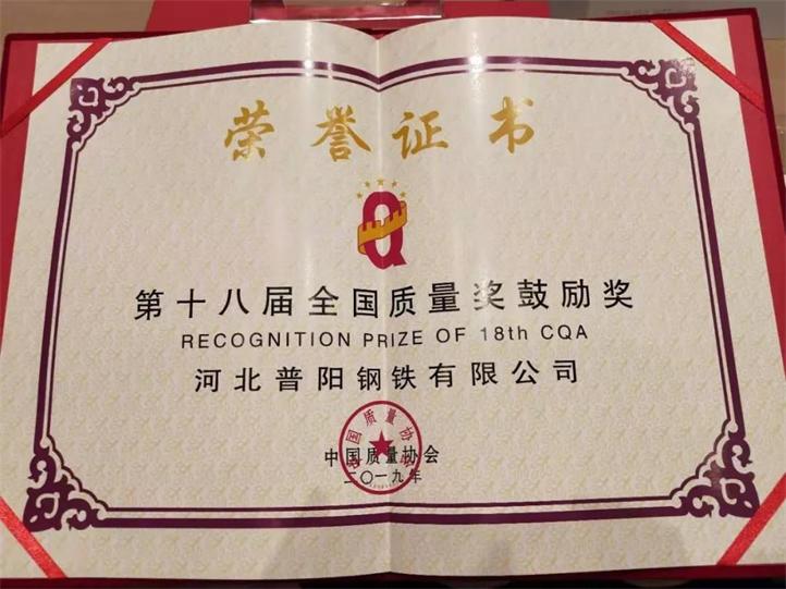 日前,2018年-2019年中國質(zhì)量協(xié)會(huì)以“卓越引領(lǐng)——邁入高質(zhì)量發(fā)展新時(shí)代”為主題,開展了第十八屆全國質(zhì)量獎(jiǎng)評(píng)審工作。評(píng)審工作堅(jiān)持“高標(biāo)準(zhǔn)、少而精、樹標(biāo)桿”的原則,經(jīng)過嚴(yán)格的資格審查、資料評(píng)審、現(xiàn)場(chǎng)評(píng)審、評(píng)審委員會(huì)審議、網(wǎng)上公示、審定委員會(huì)審定并征集相關(guān)部委意見,決定授予河北普陽鋼鐵有限公司“第十八屆全國質(zhì)量獎(jiǎng)鼓勵(lì)獎(jiǎng)”榮譽(yù)稱號(hào)。
