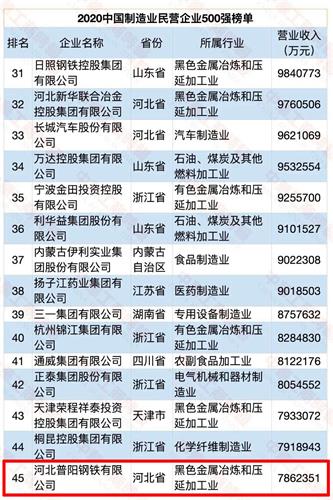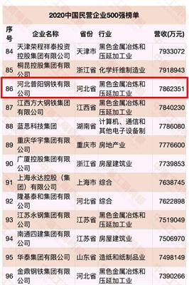 河北普陽(yáng)鋼鐵有限公司以786億元營(yíng)業(yè)收入榮列2020中國(guó)民營(yíng)企業(yè)500強(qiáng)第86位,較去年提升30個(gè)位次;中國(guó)制造業(yè)民營(yíng)企業(yè)500強(qiáng)第45位,較去年提升15個(gè)位次;整體排名居邯鄲民營(yíng)鋼鐵企業(yè)之首,成功入圍中國(guó)民營(yíng)鋼鐵企業(yè)前十強(qiáng)!