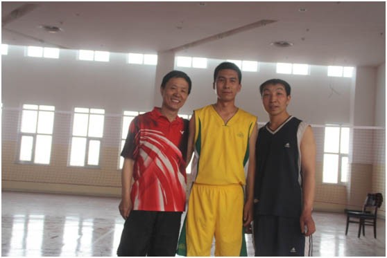 2013年“迎五一”男子羽毛球冠、亞季軍合影。左起依次為:亞軍陳建國、冠軍李延龍和季軍任志學。